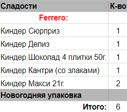 Киндер Сюрприз (1 шт), Киндер Делиз (1 шт), Киндер Шоколад 4 плитки 50 гр. (1 шт), Киндер Кантри (со злаками) (1 шт), Киндер Макси 21 гр. (2 шт)