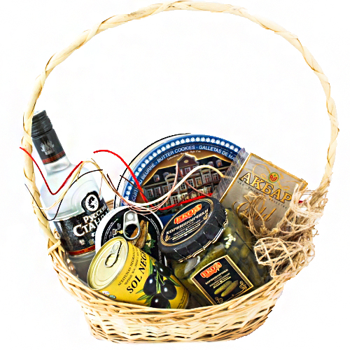 Состав: водка. шпроты, корнишоны, маслины, чай, печенье, корзина. декор