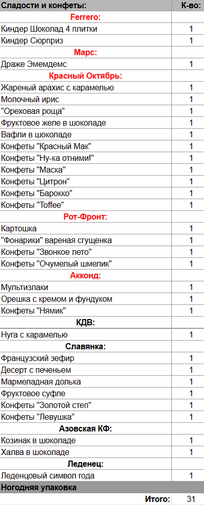 Киндер Шоколад 4 плитки (1 шт), Киндер Сюрприз (1 шт), Драже Эмемдемс (1 шт), Жареный арахис с карамелью (1 шт), Молочный ирис (1 шт), "Ореховая роща" (1 шт), Фруктовое желе в шоколаде (1 шт), Вафли в шоколаде (1 шт), Картошка (1 шт), "Фонарики" вареная сгущенка (1 шт), Мультизлаки (1 шт), Орешка с кремом и фундуком (1 шт), Нуга с карамелью (1 шт), Французский зефир (1 шт), Десерт с печеньем (1 шт), Мармеладная долька (1 шт), Фруктовое суфле (1 шт), Козинак в шоколаде (1 шт), Халва в шоколаде (1 шт), Леденцовый символ года (1 шт)