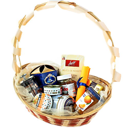 Состав: корзина, чайник френч-прес стеклянный 350мл, кофе молотый, конфеты Коркунов, паштет 2 шт, чай ж/б , паста Нутелла, печенье, поздравление работникам торговли, декор.
