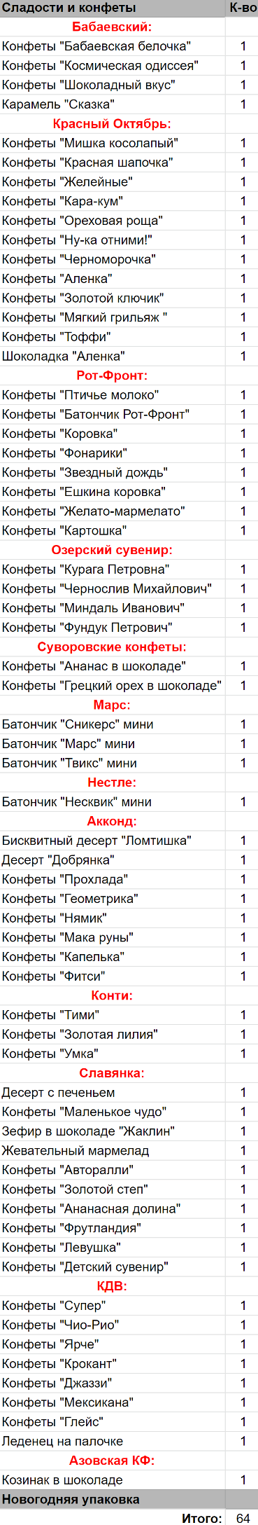Кол-во сладостей: 63 шт.