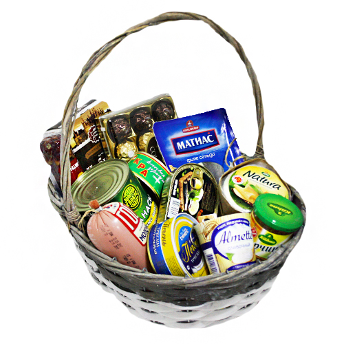Состав : Корзина, икра красная, шпроты, печень трески, горчица зерновая, филе сельди, конфеты Ferrero Collection 172 гр, колбаса молочная -500 гр, колбаса Брауншвейская 240 гр, ананасы консервированные, печенье имбирное, сыр Natura 400 гр, сыр альметто мягкий