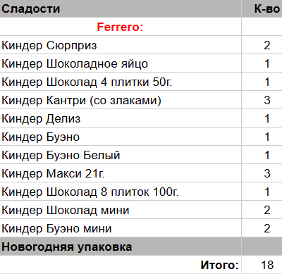 Киндер Шоколадное яйцо (1 шт), Киндер Шоколад 4 плитки 50 гр. (1 шт), Киндер Делиз (1 шт), Киндер Сюрприз (2 шт), Киндер Кантри (со злаками) (3 шт), Киндер Макси 21 гр. (3 шт), Киндер Буено (1 шт), Киндер Буено Белый (1 шт), Киндер Шоколад 8 плиток 50 гр. (1 шт), Киндер Шоколад мини (2 шт), Киндер Буэно мини (2 шт)